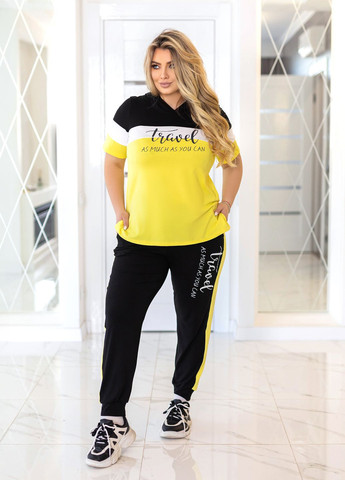 Комфортний костюм на кожен день, який виготовлено з легкої тканини Американський креп. Костюм складається з кофти оверсайз крою з рукавами до ліктя з окантовкою. Вона застібається на блискавку по центру та має круглу горловину. На талії ми розмістили куліску з шнурком, завдяки якій ви зможете відрегулювати комфортне приталення виробу. На грудях ми додали термоналіпку, що робить образ ще цікавішим. Штани вільного крою з контрастною вставкою по боках в тон кофти. Вони фіксуються гумкою на талії та доповнені бічними кишенями.