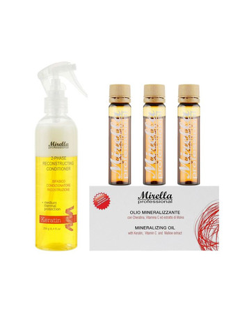 Спрей-реконструктор Mirella Professional 250 мл — 1 шт. Лосьйон для відновлення волосся Mirella Professional 6 ампул по 10 мл — 1 упаковка. Бренд: Mirella Professional Призначення: Глибока реконструкція, інтенсивне відновлення, зміцнення, живлення, зволоження, розгладжування, надання блиску, термозахист, захист від пошкоджень, для дуже пошкодженого, ослабленого, сухого волосся. Особливості спрею: Незмивний, реконструктор, термозахист, для блиску. Особливості лосьйону: Ампульний, для глибокого відновлення, концентрована формула. Спрей-реконструктор Mirella Professional 250 мл: Цей незмивний спрей є багатофункціональним засобом для миттєвого відновлення та захисту волосся. Він діє як фінішне покриття, яке запечатує кутикулу, розгладжує волосся і надає їм здорового блиску, одночасно забезпечуючи легку фіксацію та термозахист. Миттєва реконструкція: Активні компоненти спрею проникають у структуру волосся, заповнюючи пошкоджені ділянки та надаючи йому гладкість та еластичність. Розгладжування та блиск: Миттєво розплутує волосся, полегшує розчісування, надає дзеркального блиску та шовковистості. Термозахист: Створює невидимий бар'єр, що захищає волосся від високих температур при використанні фена, прасування або плойки. Захист від зовнішніх факторів: Допомагає вберегти волосся від негативного впливу навколишнього середовища та УФ-променів. Незмивна формула: Забезпечує тривалу дію активних компонентів. Зручний об'єм 250 мл: Підходить для регулярного використання. Лосьйон для відновлення волосся Mirella Professional 6 ампул по 10 мл: Цей концентрований лосьйон в ампулах — це інтенсивний відновлюючий догляд, призначений для глибокого проникнення та регенерації волосся зсередини. Кожна ампула містить потужний комплекс активних інгредієнтів, які буквально реанімують " ослаблені та сильно пошкоджені пасма. Глибоке відновлення: Активні компоненти лосьйону проникають у кортекс волосся, відновлюючи його структуру, зміцнюючи та підвищуючи еластичність. Інтенсивне харчування: Забезпечує волоссю потужний заряд поживних речовин, необхідних для їхнього здоров'я та сили. Зміцнення: Значно зменшує ламкість і кінчики, що січуться, роблячи волосся більш стійким до пошкоджень. Поліпшення текстури: Волосся стає більш щільним, гладким і пружним. Порційне пакування: 6 ампул по 10 мл гарантують точність дозування та максимальну свіжість активних компонентів при кожному використанні. Ідеально для курсового застосування. Переваги Mirella Professional: Комплексний підхід до реконструкції: Поєднання інтенсивного лосьйону та захисного спрею забезпечує всебічне відновлення волосся на різних рівнях. Інтенсивне відновлення: Набір призначений для максимально ефективної регенерації навіть сильно пошкодженого та ослабленого волосся. Захист та блиск: Спрей не тільки відновлює, а й захищає волосся від подальших пошкоджень, надаючи їм здорового, сяючого вигляду. Зміцнення та еластичність: Волосся стає міцнішим, зменшується їх ламкість, підвищується еластичність. Універсальність: Підходить для всіх типів волосся, особливо рекомендований для дуже сухого, пошкодженого, хімічно обробленого, тонкого і ослабленого. Mirella Professional – ваш професійний арсенал для повернення волоссю здоров'я, сили та блиску! Застосування Лосьйон для відновлення волосся: Після миття волосся шампунем (бажано використовувати шампун