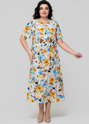 Сукня із штапелю напівприталеного силуету, відрізна по лінії. Тканина легка і тактильно приємна, але також має підвищену міцність і практичність, що відмінно підходить літнім моделям для повсякденного використання. По переду виконана планка із застібкою на 4 гудзики. Орієнтовні заміри по готовому виробу: р.54: ОГ - 112 см, ВІД - 112 см, ПРО - 144 см; ширина рукава – 20 см; ширина спинки – 43 см; р.56: ОГ - 118 см, ВІД - 116 см, ПРО - 148 см; ширина рукава – 21 см; ширина спинки – 44 см; р.58: ОГ - 122 см, ВІД - 122 см, ПРО - 152 см; ширина рукава – 22 см; ширина спинки-45 см; р.60: ОГ - 126 см, ВІД - 126 см, ПРО - 156 см; ширина рукава – 23 см; ширина спинки – 46 см; р.62: ОГ - 130 см, ВІД - 130 см, ПРО - 160 см; ширина рукава – 24 см; ширина спинки – 47 см; р.64: ОГ - 134 см, ВІД - 13 4см, ПРО - 164 см; ширина рукава – 25 см; ширина спинки – 48 см. Довжина рукава: р.54, 56, 58, 60 - 27 см; р.62,64 – 28 см. Довжина виробу: р.54,56 – 127см, р.58,60 – 131 см, р.62,64 – 133 см.