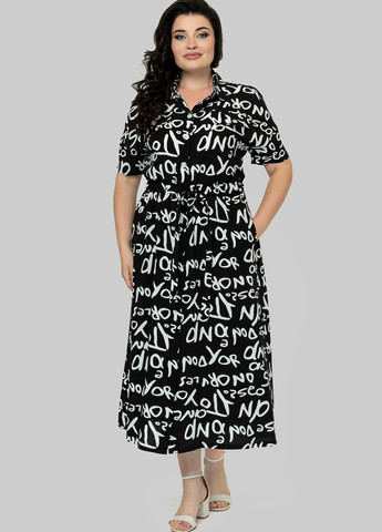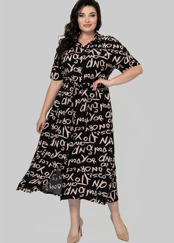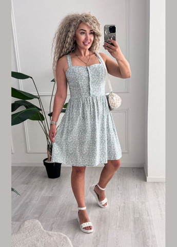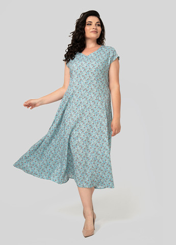 Сукня виготовлена зі штапельної тканини, на дотик має гладку фактуру. Тканина має мінімальну еластичність, враховуйте це під час підбору розміру. Завдяки своєму А-силуетному фасону та міді-довжині гарно сідає по фігурі. Сукня з короткими рукавами, плечовий шов знаходиться на природній лінії плеча. Сукня має вертикальні виточки та відрізну талію по спинці, додатково декоровану рюшами. По низу вшитий волан. Також вона має V-подібний виріз коміра, що утворює гарний виріз декольте.
