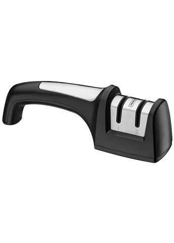 Характеристики Має зручну ручку, яка не сковує руху, а дно покрите протиковзким покриттям. Це означає, що навіть при докладання більшої сили точилка залишається на одному місці, що забезпечує безпечне та комфортне використання. Матеріал: із чорного пластику та нержавіючої сталі Не можна мити в посудомийній машині Розміри: 9,5x5,1 см (основа), висота 4 см Використання 1 етап: карбід-вольфрамовий для грубого заточування 2 етап: керамічне для полірування