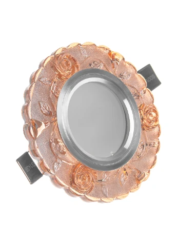 світлодіодний декоративний точковий світильник HDL-G270 LED 3W G призначений для додаткового підсвічування всього інтер'єру або окремих його складових: полиць, арок, зон відпочинку або робочих зон. Каркас світильника виготовлений з металу, забарвлений в колір хром. По периметру декорований скляними, золотистими, гранованими камінчиками, які на сонячному світлі або при світлі лампи будуть переливатися кольорами веселки, відтворюючи красиву гру світла. Скляні камінчики імітують форму квітки. Тильна сторона обладнана металевими «лапками», які забезпечать надійне кріплення точки на горизонтальній або вертикальній поверхні. Джерелом світла служать 3 світлодіода, загальною потужністю 3 Вт. Світильник розрахований для роботи від мережі 220 В (трансформатор входить в комплект)