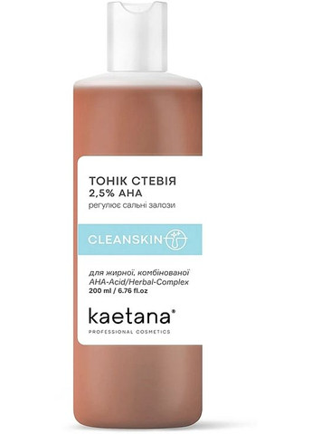 Тонік Стевія 2,5% AHA-кислоти підтримує необхідний рН шкіри для кращого проникнення активних інгредієнтів, пом'якшує, зволожує та м'яко готує шкіру обличчя для наступних процедур; знімає подразнення, усуває почервоніння та стимулює обмін речовин у шкірі; завдяки AHA-кислотам тонік насичує шкіру вологою, делікатно відлущує мертві частки шкіри та надає шкірі матовостіДля кого: для жирної, комбінованої або проблемної шкіри; шкіра з підвищеним вмістом ліпідів, елементами акне, мікрорельєф неоднорідний, пори розширені і закупорені, шкіра груба, лискуча, має тьмяний відтінок Вплив: протизапальний, антисептичний, тонізуючий; знімає почервоніння і подразнення, стимулює обмінні процеси в шкірі, покращує тканинне дихання, відновлює вуглеводний, ліпідний і білковий обмін; ефективно очищує шкіру від всіх видів забруднень, видаляє надлишки шкірного сала, звужує пори, регулює роботу сальної залози, активізує процеси регенерації клітин, усуває пігментацію, вирівнює рельєф шкіри. Активні інгрідієнти: вода очищена, екстракт календули (нагідок), екстракт чистотілу, екстракт евкаліпта, екстракт стевії, магній хлорид, гліколева кислота, молочна кислота, лимонна кислота, яблучна кислота, аскорбіл фосфат натрію (вітамін C), винна кислота, триклозан, пег-40 рицинової олії, бензиловий спирт, пропілен гліколь, парфумерна композиція.