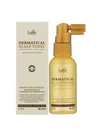 Тонік для волосся і шкіри голови зміцнює Lador Dermatical Scalp Tonic - натуральний тонік призначений для оздоровлення шкіри голови і волосся. Рекомендується для чутливої шкіри і ослабленого волосся. Застосування тоніка заспокоює шкіру голови, зволожує і живить її, покращує кровообіг, зміцнює волосяні цибулини, завдяки чому волосся стає більш сильними, попереджається їх випадання. Самі волосся також оздоровлюються, розгладжуються, стають пружними і еластичними. У складі тоніка натуральні екстракти женьшеню, алое вера і зеленого чаю, які надають зволожуючу, заспокійливу і протизапальну дію, усувають лупу та свербіж, а також надають могутню антиоксидантну дію, попереджають передчасне старіння волосся. Спосіб застосування: з невеликої відстані розпорошити тонік і акуратно промасажувати шкіру голови, не змивати. Рекомендується використовувати до 2-3 разів на день. Об'єм: 50 мл. Склад: WATER, ALCOHOL, L-MENTHOL SALICYLIC ACID, DEXPANTHENOL, ALLANTOIN, NIACINAMIDE, HYDROLYZED KERATIN, HYDROLYZED COLLAGEN, HYDROLYZED SILK, SOPHORA FLAVESCE NS ROOT EXTRACT, CAPSICUM ANNUUM FRUIT EXTRACT, LYCIUM CHINENSE FRUIT EXTRACT CAMELLIA SINENSIS LEAF EXTRACT, ANGELICA GIGAS ROOT EXTRACT, ANGELICA DAHURICA ROOT EXTRACT, RUBUS COREANUS FRUIT EXTRACT, MORUS ALBA ROOT EXTRACT, PINUS PALUSTRIS LEAF EXTRACT, LITHOSPERMUM OFFICINALE ROOT EXTRACT, POLYGONUM MULTIFLORUM ROOT EXTRACT POLYSORBATE 20, PEG-60 HYDROGENATED CASTOR OIL, SODIUM CITRATE, PHENOXYETHANOL, DISODIUM EDTA, PERFUME GLYCYRRHIZATE, DIPOTASSIUM.