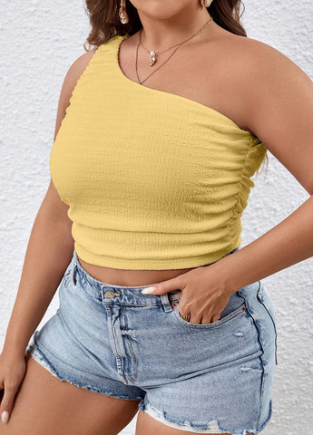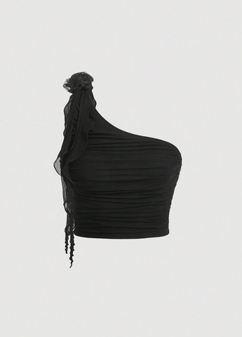 Наш елегантний монолітний сітчастий топ із рюшами на одне плече має розкішний дизайн без рукавів із асиметричним вирізом та короткою довжиною. Виготовлений із трикотажу середньої еластичності цей топ демонструє складні аплікації та рюші для додаткової елегантності. Простий принт надає витонченості цьому вишуканому стилю.