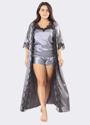 Комплект виконаний з легкої тканини атлас. У комплекті довгий халат, топ і шорти. Довгий халат з обробкою з французького мережива, на запах, рукав реглан - три чверті. Топ на тонких бретелях з обробкою з французького мережива. Шорти на гумці, по низу французьке мереживо.