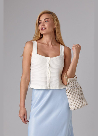 Оригінальний топ на гудзиках ідеально впишеться у ваш повсякденний гардероб, а м'яка тонка в'язка, з якої виконана ця новинка, подарує тілу комфортні відчуття та дасть можливість створювати різні образи залежно від низу. У моделі квадратна горловина. Оригінальності виробу надають фактурний орнамент горизонтальну смужку і маленькі круглі гудзики. Довжина переду виробу, см 46см Ширина під проймами рукавів (над грудьми), см 38см