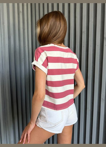 Літній костюм, що облягає, виконаний з трикотажного рубчика рожевого однотонного кольору. Топ без рукавів з напівкруглою горловиною та облягаючим укороченим кроєм. Високі облягаючі шорти з короткою довжиною та поясною еластичною гумкою.