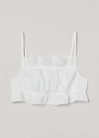 Короткий топ із тканого матеріалу. Широкі бретелі із декоративним вузлом зверху. Вузька покрита резинка по верхньому краю із подвійними воланами. Низ із оборками та вузькою потайною резинкою.