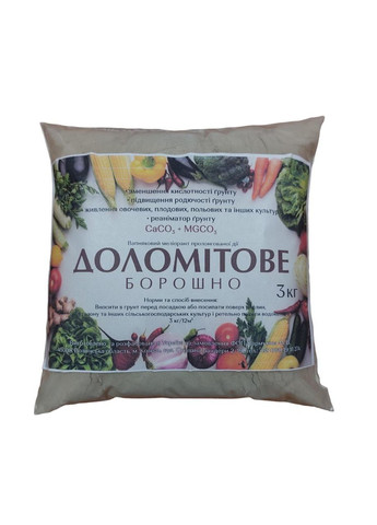 Доломітове борошно – це продукт природного походження, який отримують з карбонатних доломітових вапняків в результаті розміли породи до порошкоподібного стану. Доломітове борошно вапняна має білий або сіруватий колір, що свідчить про те, що в ньому не міститься різних добавок. Основними діючими компонентами є кальцій і магній. Сумарний вміст цих елементів становить 94%, з яких близько 76% припадає на CaCO і 18% на MgO. Крім кальцію та магнію до складу доломітового борошна входять такі мікроелементи, як мідь, цинк, марганець. Властивості та користь доломітового борошна ✓ Доломітове борошно – відмінний меліорант. Обробка грунту борошном вапняним доломітовим нормалізує кислотність грунту, удосконалює структуру верхнього родючого шару та збагачує його такими мікроелементами як кальцій, магній і калій. Завдяки високому вмісту кальцію доломітове борошно покращує розвиток кореневої системи рослин, а магній в його складі необхідний для фотосинтезу, що дозволяє прискорити розвиток пагонів. ✓ Доломітове борошно зменшує кількість бур'янів в городі, дозволяє позбавиться від комах-шкідників (наприклад, колорадського жука), розчиняючи їх хітиновий покрив, а також сприяє активізації діяльності корисних мікроорганізмів та кільчастих хробаків, які здійснюють оздоровчий вплив на грунт. ✓ Вапняне доломітове борошно очищає рослину від радіоактивних речовин і підсилює дію внесених органічних та мінеральних добрив, так як рослини починають краще засвоювати необхідні речовини з грунту. Все це збільшує врожайність овочів та ягід й підвищує їх стійкість до хвороб. ✓ Доломітове борошно для рослин є екологічно безпечним, не несе шкоди здоров'ю людини, тварин та птахів. Головне – пам'ятати про рекомендовані норми внесення доломітового борошна в грунт. Надлишок доломітового борошна може призвести до втрати врожайності і навіть загибелі насаджень. Розкислення грунту доломітовим борошном дозволяє створити сприятливі умови для гарного росту вишні, черешні, яблуні, винограду, жимолості, смородини, полуниці, малини, томатів, перцю, огірків, баклажанів, капусти, картоплі, моркви, буряка, цибулі, часнику та інших с/г культур, що потребують грунти, близькі до нейтральних. Доломітове борошно крім саду, городу та теплиці, може застосовуватися також на клумбах, де його вносять під троянди, флокси, клематис та інші квіти. А ось для таких культур як лохина, чорниця, журавлина, брусниця, гортензія, рододендрони, верес, які спеціально висаджують у верховий кислий торф , борошно доломітове вапняне завдасть шкоди. На ділянці, де вирощується садові лохина, не потрібно понижати кислотність торфу. Навпаки, з часом при підвищенні кислотності торфу Вам потрібно буде його закислити (підкислити) за допомогою гранульованої або колоїдної сірки. Вносити доломітове борошно при всій його натуральності безконтрольно не можна. Перш ніж розкислювати грунт доломітовим борошном на дачі або на полях фермерського господарства, вкрай бажано зробити аналіз грунту в лабораторії або самостійно визначити кислотність грунту за допомогоюсадових вимірювальних приладів (наприклад, лакмусового паперу, pH метру) або народними методами. Це дозволить визначити, скільки доломітового борошна необхідно внести в грунт. Норми внесення доломітового борошна Реакція грунтового розчину Показн