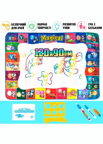 Дитячий килимок для малювання водою Aquamagic Magical Aqua Mat розвиваючий акваковрик з водними маркерами Набір для малювання водою Aqua Magic – подарунок для маленького художника. Дитина малюватиме маркером, який наповнюється звичайною водою. Тож чистота будинку гарантована! Через деякий час картинки зникають і можна знову приступити до малювання нових. Відмінною особливістю набору є наявність додаткових аксесуарів для малювання – яскравих трафаретів на різну тематику, які перетворять процес навчання малюванню на захоплюючу гру. Характеристики: Розмір килимка: 120см х 90см Маса, 374гр. Матеріал – текстиль Вік від 3 до 8 Стать: унісекс Колір: кольоровий Комплектація: 1 килимок для малювання водою 1 трафарет (6 фігур) 2 різних фломастери для наповнення водою 1 брошура з прикладами Заводська упаковка