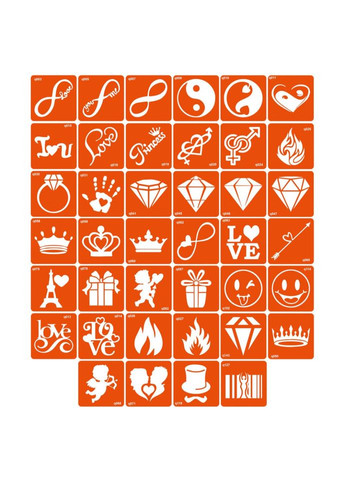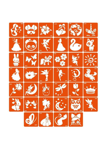 Колекція простих трафаретів різних, 40 штуки в розмірі 6 на 6 см. Як зробити біо-тату: виберіть рівномірну ділянку шкіри; добре знежирте її; зніміть із трафарету білу підкладку (паперова основа трафарету); приклейте трафарет на суху і знежирену шкіру; акуратно зніміть прозору плівку і переконайтеся, що трафарет (помаранчева частина) щільно приклеєний до шкіри; нанесіть рівномірний шар клею для боді-дизайну і дайте йому просохнути (від 30 секунд до 2 хвилин залежно від шару клею); нанесіть гліттер (блискітки) на клей і щільно вбийте його пензлем для гліттера; змахніть надлишки гліттера пензлем-зміткою і зніміть трафарет. Для чого потрібен трафарет: якщо не вмієте малювати від руки; якщо потрібно багато і швидко малювати; потрібно створювати однакові і за розміром, і за зовнішнім виглядом малюнки - скористайтеся трафаретами Fresh Tattoo; трафарети Fresh Tattoo безпечні для шкіри та підходять для нанесення тимчасових тату всіх типів: гліттер-тату, хною, оксамитом, пігментом, джагуа-гелем тощо; підходять для хімічного або піскоструминного матування виробів зі скла (чашки, келихи, дзеркала) Характеристики: Габарити: довжина: 10,5 Габарити: ширина: 0,5 Габарити: висота: 7,5 Стан: нове Вікова група: Від 6 років Матеріал: Комбінований Колір: Різні кольори Упаковка: Поліетиленовий пакет Вид: Трафарети для тату Вік: Від 6-ти років Гарантія: 14 днів Стать: унісекс Країна реєстрації бренду: Україна Країна-виробник товару: Україна