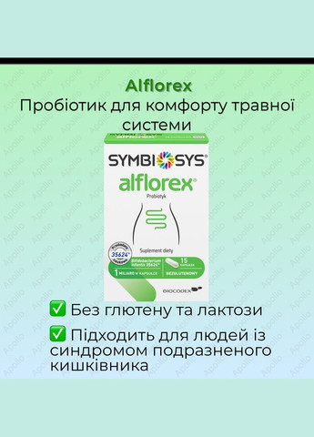 Symbiosys Alflorex — це дієтична добавка, що містить унікальний пробіотичний штам Bifidobacterium infantis 35624®, спеціально розроблений для підтримки балансу мікрофлори кишечника при синдромі подразненого кишечника (СРК). Основні властивості Містить 1 млрд КУО Bifidobacterium infantis 35624® у кожній капсулі Сприяє зменшенню симптомів СРК: здуття, газоутворення, дискомфорт, порушення стулу Підтримує баланс мікробіоти кишечника Не містить глютену, лактози, підходить для веганів Безпечний для щоденного застосування Склад Кукурудзяний крохмаль Гідроксипропілметилцелюлоза (оболонка капсули) Bifidobacterium infantis 35624® Магнієві солі жирних кислот (антизлежувач) Сахароза, трегалоза Цитрат натрію (стабілізатор) Спосіб застосування Дорослим: по 1 капсулі на день, запиваючи склянкою води Рекомендований курс — не менше 4 тижнів Можна приймати незалежно від їжі Не потребує зберігання в холодильнику Протипоказання Індивідуальна чутливість до компонентів Не перевищувати рекомендовану дозу Не використовувати як заміну повноцінного харчування