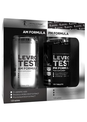 Вміст елементів у 1й порції: LevroTest AM Formula 5 таблеток D-аспарагінова кислота 3120 мг Екстракт кореня родіоли рожевої 100 мг - розавини 3 мг - салідрозиди 1 мг Екстракт кореня горця 100 мг - ресвератролу 50 мг Вітамін D 25 мкг Вітамін В6 2 мг Вітамін В9 (фолієва кислота) 400 мкг Вітамін В12 6 мкг Інгредієнти D-аспарагінова кислота (DAA), наповнювачі (E460(i), E341), мальтодекстрин, зміцнюючі агенти (E464, E422), протистежуючі агенти (E470b, E551, E553b), екстракт кореня родіоли рожевої (Rhodiola; розавінів, 1% салідрозидів), екстракт кореня горця японського (Fallopia japonica (Houtt). Ronse Dec.; 50% ресвератрол), вітамін D (холекальциферол), вітамін B6 (піридоксину гідрохлорид), вітамін B12 (ціанокобаламін), фолієва кислота (птеромо (E1202), глазуруючий агент (E1521). LevroTest PM Formula 4 таблетки Екстракт насіння пажитника 1100 мг Екстракт плодів трибулус терестрис (Tribulus terrestris) 1000 мг - сапоніни 900 мг Магній 90 мг Цинк 15 мг Вітамін В6 10 мг Інгредієнти комплекс рослинних екстрактів [екстракт насіння пажитника (Trigonella foenum-graecum L.), екстракт плодів трибулуса стелиться (Tribulus terrestris L.; (90% сапонінів)], наповнювачі (E460(i), E341), мальтодекстрин, магнієві солі антистежувачі (E470b, E551, E553b), стабілізатори (E1201, E1202), сульфат цинку, вітамін B6 (піридоксину гідрохлорид), зміцнюючий агент (E464), глазуруючий агент (E1521), барвники (E102, E129, E150b, E15