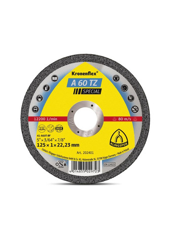Відрізні круги Kronenflex A 60 TZ Special Відрізні круги Kronenflex A 60 TZ Special із товщиною 1 мм надзвичайно тонкі, але в той же час характеризуються високою агресивністю та тривалим терміном служби. Цей високоефективний круг чудово підходить для різання листового металу, тонких труб або профілів із таких матеріалів: нержавіюча сталь;вуглецева сталь;кольорові метали. Відрізний круг Kronenflex A 60 TZ Special від компанії Klingspor використовують переважно для робіт із технічного обслуговування та ремонту в слюсарній справі, а також у будівництві споруд і монтажі сталевих конструкцій Комплект поставки: Відрізний диск Klingspor - 1 шт
