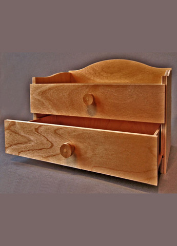 Дерев’яний міні-комод. Невеликий комод - це майже така ж важлива приналежність для спальні, як і ліжко. Адже він здатний замінити собою і приліжкову тумбу, і навіть виконати функцію невеликої шафи, оскільки практичний, місткий і оригінальний. Нижня білизна, прикраси та біжутерія, косметика та особисті дрібниці - все це розмаїття поміститься в такий комод. Розміри зовнішні: висота - 25см, глибина - 17см, ширина - 30см. Матеріал: дерево. Покриття: акриловий лак. Виріб ручної роботи та виготовлений виключно з натуральних, екологічно чистих матеріалів.