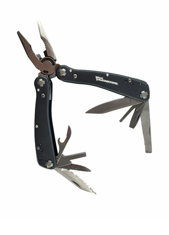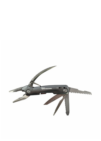 Мультитул Protool від бренду TheGeneral – це універсальний багатофункціональний інструмент 11 в 1, призначений для широкого використання. Кишенькову модель, яка заміняє цілий набір інструментів, беруть у подорожі, на полювання чи на риболовлю. Для любителів туристичних походів мультитул став майже обов’язковим аксесуаром. Мультитул допоможе закрутити всі болти, відрізати провід, інструмент завжди готовий до будь-якої непередбаченої ситуації. Розкладні механізми такі міцні, що дитина ніколи не зможе відкрити ножа, що є великим плюсом.Під одним корпусом зібрані: плоскогубці, кусачки, два ножі, напилок, пилка, відкривачка для пляшок, консервний ніж, 3 види викруток. Мультитул виготовлений з нержавіючої сталі марки 420. Під цією маркою випускають нержавіючу сталь, зміцнену термообробкою. Матеріал має гарну корозійну стійкість, тому інструмент не боїться іржі. Використання нержавійки 420 робить інструмент міцним, зносостійким та довговічним.Накладкимультитула виготовлені з алюмінію, це дає змогу впевнено тримати його в руці без зісковзування під час роботи.Мультитул приємно тримати в рукаж під час роботи, інструмент має ергономічну форму і досить компактні розміри – 100 х 48 х 20 мм. Виріб упакований в графітовий неопреновий чохол. Вага моделі – 247 г.