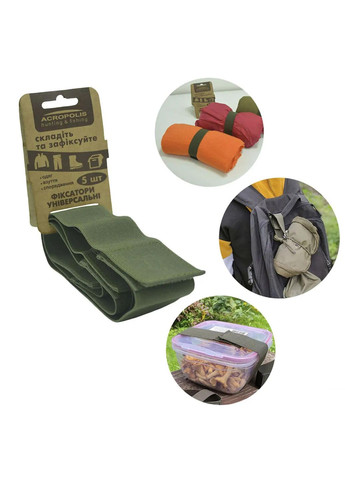 Комплект гумок - фіксаторів для речей, виконаних з міцної еластичної стрічки для стяжки одягу, взуття, спорядження, підвішування речей, сумок та чохлів під час відпочинку на природі, туристичного походу чи поїздки, риболовлі та полювання, пікніку і кемпінгу. В комплект входить 5 стрічок з текстильними застібками липучками. Гумки в фірмовому оливковому кольорі різні по довжині та ширині, а саме:50х5см;40х5см;40х4см;30х2,5см;25х2,5см. Практичні текстильні стрічки:для стяжки спорядження (дозволяють компактно скласти його в сумці, рюкзаку чи багажнику автомобіля);можуть замінити карабін для підвішування нетяжких речей;можна використати, як гумку для фіксації коробок, контейнерів тощо.