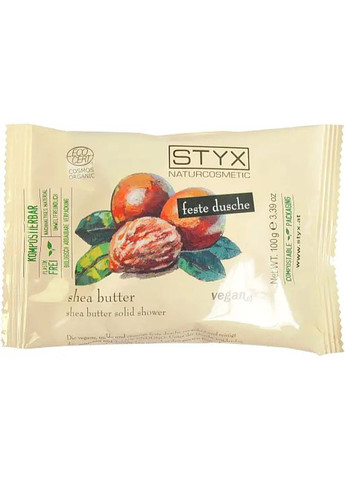 Забудьте про дискомфортне відчуття стягнутості та лущення шкіри після душу з натуральним твердим милом від бренда Styx Naturcosmetic. Воно містить делікатні мийні компоненти рослинного походження, що забезпечують дбайливе очищення епідермісу, проте не порушують цілісність його ліпідної мантії. До того ж засіб збагачений живильним маслом ши, яке є джерелом цілого комплексу корисних для шкірного покриву речовин. Воно проявляє зволожувальну, відновлювальну та пом'якшувальну активність. Особливості Shea Butter Solid Shower від бренда Styx Naturcosmetic: - натуральна кремова формула з маслом ши;- добре піниться;- ефективно усуває зі шкіри забруднення, себум, піт, ороговілі часточки та бактерії;- зволожує та живить шкіру;- дарує відчуття комфорту;- делікатно пом'якшує епідерміс;- надає шкірному покриву шовковистості та оксамитовості;- підходить для веганів;- відзначене сертифікатом EcoCert;- екологічне біорозкладне паковання з компостної плівки.