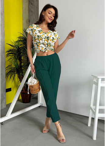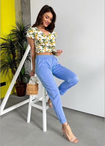 Легкий повсякденний костюм трійка. Тканина - двунитка, кулір Турція. Складається з сорочки, футболка та штанів. Футболка з стразами середньої довжини. Штани прямого покрою, з кишенями. Сорочка ззаду трішки приспущена, рукава вкорочені та прямі. Комплект легко поєднується з будь якими речами та чудово доповнить ваш гардероб.