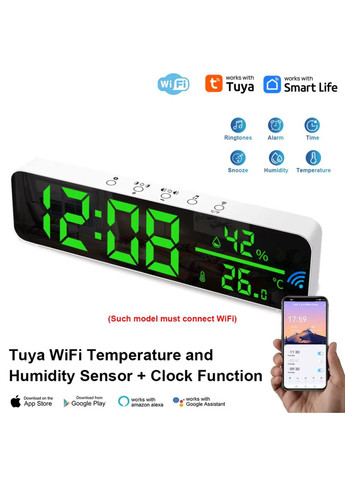 Сучасне рішення для вашого смарт-дому — WiFi-датчик температури й вологості Tuya з LED-дисплеєм та функцією будильника. Це багатофункціональний пристрій поєднує стиль, точність і зручність керування через додаток. Розмір: 24 х 7.1 х 2.6 см Основні характеристики: Інтеграція з розумним домом: Повна сумісність із платформами Tuya Smart і Smart Life. Дистанційне керування через смартфон, підтримка Wi-Fi 2.4G. Багатофункціональний дисплей: Великий дзеркальний LED-екран з відображенням температури, вологості й часу. Будильник: Функція будильника з 9 мелодіями на вибір та ручним регулюванням гучності. Універсальні налаштування: • Формат часу 12/24 години • Регулювання яскравості в 3 рівнях • Перемикання між °C та °F Якісні матеріали: Виготовлений із міцного ABS-пластику, стійкий до зношування. Компактний дизайн: Мінімалістичний і стильний, пасує до будь-якого інтер'єру. Живлення: Працює від USB (DC 5V), адаптер не входить до комплекту. Комплектація: 1 × Датчик Tuya 1 × Інструкція користувача