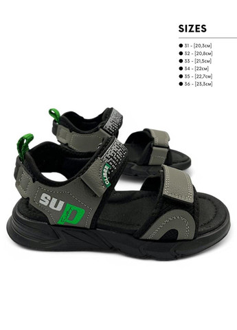 Дитячі сандалі для хлопчика кольору хакі спортивний план на липучки. Має привабливий вигляд, оригінальний дизайн, відмінну зносостійкість. Верх – текстиль + еко шкіра Підошва – піна. Висота підошви 2-3 см Устілка еко-шкіра, є супінатор На нозі фіксується за допомогою 2 липучок. Підійде на ногу середньої стандартної повноти. Для вибору свого розміру, дивіться розмірну сітку на цю модель: (зазначено замір усієї устілки, від краю до краю) 27р - 17,5 см 28р - 18 см 29р - 18,8 см 30р – 19,5 см 31р – 20,2 см 32р - 20,8 см