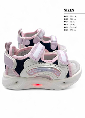 Сандалії для дівчинки з LED-підсвіткою. Стильні та зручні сандалії, виготовлені з якісних матеріалів. Мають три липучки для надійної фіксації на ніжці. Легка підошва з піни забезпечує комфорт під час ходьби. Усередині — шкіряна устілка з профілактичним супінатором для підтримки правильного формування стопи. Весела LED-підсвітка додає яскравості кожному кроку! Гарантія на LED-підсвітку не поширюється. Розмірна сітка: 22р. устілка 13.5 см; 23р. устілка 14.5 см; 24р. устілка 15.0 см; 25р. устілка 16.0 см; 26р. устілка 16.5 см; 27р. устілка 17.0 см.