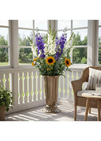 Елегантна підлогова пластикова ваза Флора висотою 51 см — стильне рішення для дому, офісу чи тераси. Колір «Платина» надає вазі сучасного шляхетного вигляду, що чудово поєднується із зеленими рослинами та яскравими букетами. Виготовлена з міцного пластику, стійкого до ультрафіолету й вологи, не боїться перепадів температур і легко миється. Завдяки об’єму 12 літрів і широкому верхньому діаметру 27,5 см підходить як для живих, так і для штучних квітів. Використовується в інтер’єрі, на балконах, верандах чи в садах. Характеристики: Тип: ваза для квітів / підлоговий вазон Матеріал: пластик (PP) Об’єм: 12 л Висота: 51 см Діаметр верху: 27,5 см Колір: платина Форма: висока, стійка Країна виробництва: Україна Бренд: Алеана