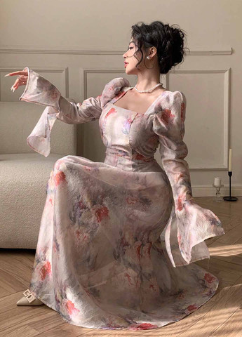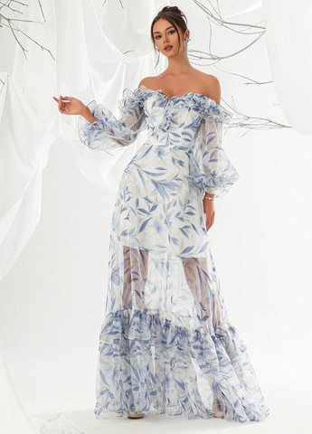 Елегантна сукня з відкритими плечима. Довга сукня з квітковим принтом по всій поверхні. Рукави-бішоп і оборка внизу. Сукня виконана із злегка еластичної органзи. Підходить для урочистих та вечірніх заходів.