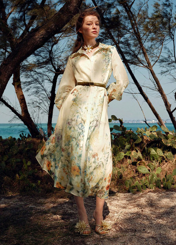 Вечірня сукня Belle прикрашена квітковим принтом м'ятного кольору. Має підвищену талію та розкльошений низ. Ліф прикрашений прозорою сітчастою деталлю. Сукня має виріз на тонких бретельках та рукавах з відкритими плечима. Вона виготовлена із нееластичної тканини.