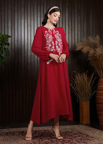Елегантна бордова сукня з квітковим принтом. Це сукня з довгими рукавами, фігурним вирізом та рукавами-бішоп. Сукня має прямий поділ та середню лінію талії. Дизайн доповнений квітковою вишивкою. Ця сукня підійде для урочистих та вечірніх заходів.