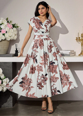 Жіноча сукня Anewsta з V-подібним вирізом та квітковим принтом. Висока талія. Підходить для офіційних та вечірніх заходів. Машинне прання або професійна хімчистка.