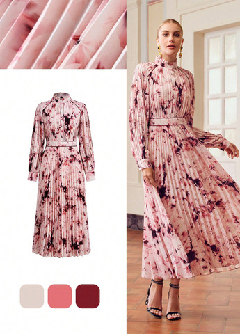 Сукня міді ZEYLAH – різнокольорова. Це елегантна сукня міді з високою талією та плісованим подолом. Довгі рукави та комір-стійка. Сукня виконана з поліестеру. Сукня прикрашена кольоровими блоками, квітковим принтом та принтом тай-дай по всій поверхні. Підходить для урочистих та вечірніх заходів, включаючи День святого Валентина.