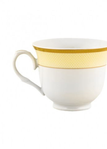 Ця проста порцелянова чашка з ненав'язливим золотистим геометричним візерунком, досить товстостінна і міцна, вона прослужить вам не один рік. Класичні чайні чашки потрібні в кожному будинку. І зовнішній вигляд цих чашок також має велике значення. Адже багато людей роками п'ють з улюбленої чашки, а це вже більше. ніж просто прихильність. Це так звана віденська чашка. По суті це просто піала з ручкою, вона походить від китайської іньской чашки, до якої європейці приробили ручку. Пити гарячий чай з такої чашки стало зручніше, і це більше відповідало європейським поглядам на естетику. Двісті мілілітрів класичний для чаювання об'єм. Чашка виготовлена з кістяної порцеляни. Кістяний фарфор в Європі називали королівським або білим золотом. У Китаї, звідки він родом, за благородну тонкість його називали яєчною шкаралупою. Секрет виробництва зберігали як зіницю ока. Для кістяної порцеляни характерна особлива білосніжність, витончена тонкість і благородний звук при постукуванні. Тепер можна розкрити віковий секрет: всіма цими властивостями фарфор наділяє кісткова зола тваринного походження. Завдяки натуральній сировині, вироби з кістяної порцеляни абсолютно безпечні для здоров'я.