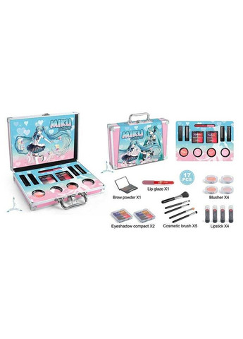 Ключові особливості косметичного набору: Зручність: Компактний бокс-валіза на блискавці для легкого транспортування та зберігання. Функціональність: Вбудоване дзеркальце (не забудьте зняти захисну плівку). Різноманітність: Великий вибір косметичних засобів і набір для нігтьового дизайну. Легке видалення: Косметика легко змивається теплою водою, а лак на водній основі знімається тонкою плівкою без спеціальних засобів. До комплекту дитячого набору косметики, представленого на зображенні, входять такі предмети: Косметичка-єдиноріг: рожева косметичка у формі голови єдинорога для зберігання косметики. Тіні для повік: палетка тіней для повік. Рум'яна: компактні рум'яна. Блиск для губ/Помади: кілька тюбиків блиску для губ або помад. Лаки для нігтів: кілька флаконів лаку для нігтів. Пилочка для нігтів і наклейки для нігтів: пилка та набір наклейок для прикрашання нігтів. Набір пензлів: кілька пензлів для нанесення макіяжу. Спонжи: два рожеві спонжі для макіяжу. Шпильки/аксесуари для волосся: кілька шпильок або інших аксесуарів для волосся