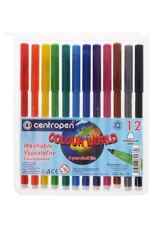 Фломастери Centropen (Центропа) - набір яскравих фломастерів, які відмінно підійдуть для створення шедеврів вашим малюком. Основні переваги: фломастери не висихають без ковпачка до 10 днів круглий корпус з поліпропілену з ергономічною зоною захоплення зменшує напругу м'язів пальців круглий пишучий вузол, ширина лінії - 1-2 мм пишучий вузол витримує велике навантаження без деформації ковпачок вентильований фломастери легко змиваються з рук та відпираються з одягу чорнило безпечне для здоров'я термін зберігання - 5 років Характеристики В комплекті: 12 шт. Виробник: Centropen, Чехія.