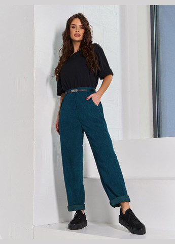 Вільні темно-зелені штани банани з високою посадкою на талії. Штани оснащені застібками на гудзики та блискавку, поясними шльовками та гумкою ззаду на поясі. Модель із бічними та задніми накладними кишенями виконана з однотонного вельвету.. Напівобхват: Талія: S (35), M (37), L (39), XL (41), Стегна: S (50), M (52), L (54), XL (56), Довжина виробу - 100, Довжина по внутрішньому шву - 70, Тканина: Низька еластичність.