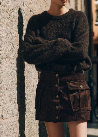 Коротка спідниця на ґудзиках з м'якого бавовняного вельвету з ґудзиками спереду та бічними кишенями-книжками із клапанами на ґудзиках. Без підкладки.