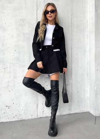 Жіночий класичний костюм з м'якого вельвету – ідеальний вибір для демісезону. Тканина з фактурою дрібного рубчика виглядає стильно та приємна на дотик. Комплект складається з сорочки на гудзиках, спереду накладна кишеня на грудях та спущений рукав на манжетах. Джогери на гумці з двома кишенями. Універсальний фасон підходить для щоденного носіння, роботи чи прогулянок.