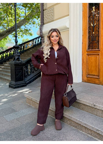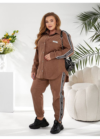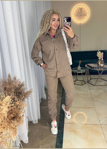 Жіночий класичний костюм з м'якого вельвету – ідеальний вибір для демісезону. Тканина з фактурою дрібного рубчика виглядає стильно та приємна на дотик. Комплект складається з сорочки на гудзиках, спереду накладна кишеня на грудях та спущений рукав на манжетах. Джогери на гумці з двома кишенями. Універсальний фасон підходить для щоденного носіння, роботи чи прогулянок.