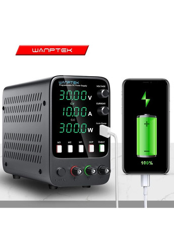 Лабораторний регульований блок живлення. Wanptek APS3010H — це цифровий регульований лабораторний блок (джерело) живлення постійного струму, який може одночасно та з високою точністю зображати напругу, струм, а також споживану потужність на дисплеї з 4-розрядними індикаторами. Невеликий розмір, легка вага та високий запас потужності дає змогу використовувати цей лабораторний блок живлення в лабораторіях, школах і виробничих лініях, вдома, для заряджання будь-яких акумуляторів. Вихідна напруга від 0 до 30V і вихідний струм від 0 А до 10A мають плавне регулювання. ЛБП може похвалитися гарною стабільністю, низьким коефіцієнтом пульсації й максимальним схемою захисту. Може працювати тривалий час (24 години 365 днів) за повного навантаження без шкоди для себе та пристроїв, що під'єднуються. Контроль температури з високоефективним вентилятором охолодження на задній панелі блока розрахований на довгий термін експлуатації. Це джерело живлення може застосовуватися в тестуванні виробничої лінії, обслуговуванні мобільних телефонів, комп'ютерів і електроприладів, заряджанні акумуляторів, використовується в лабораторіях і для навчання. А також для решти обладнання, де потрібне джерело живлення постійного струму. Переваги цієї моделі лабораторних блоків живлення: - Два режими роботи з автоматичним перемиканням. Режим постійної напруги та режим постійного струму; - Має функцію вимкнення виходу ЛБП; - Має функцію OCP (Over Current Protection). Вимкнення у разі перевищення встановленого струму - Має три кнопки пам'яті для швидкого вибору необхідних параметрів; - Має функцію попереднього встановлення вихідного струму та напруги; - Має USB-вихід зі швидким заряджанням Це лабораторне джерело живлення зручніше для заряджання акумуляторів, ніж автоматичне ЗП: 1. Автоматичні зарядні пристрої не дають змогу встановлювати необхідний номінальний струм заряду для акумуляторів різної ємності, через що акумулятор заряджається неправильно та втрачає ємність. Для правильного заряджання акумулятора зарядний струм встановлюється залежно від номінальної ємності акумуляторної батареї. Наприклад, для олив'яних батарей це 0,1С, а для літій залізо фосфатних LifePo4 це 0,5С. 2. Заряд різних акб здійснюється одним і тим самим струмом. Водночас акумулятори малої ємності заряджаються струмом більше номінального в 3-5 разів, а великою ємністю струму менш ніж номінальний 1,5-2 рази. Акумулятори малої ємності за такого заряду починають кипіти й можуть здутися, а великої місткості зазнає сульфатації (хімічні процеси не протікають у потрібному об'ємі. І в одному й іншому разі акумулятор дуже швидко втрачає ємність і може вийти з ладу. 3. Для відновлення місткості акб унаслідок сульфатації або глибокого розряджання батарею необхідно заряджати струмом утричі більше номінального. 4. В автоматичних ЗП немає можливості встановлювати кінцеву напругу заряду. 5. Автоматичні ЗП не можуть заряджати збирання послідовно з'єднаних акумуляторів 24 В, 36 В, 48 В, 60 В тощо. Продукти нової серії Waptek. Ця модель являє собою мініатюрне імпульсне джерело живлення постійного струму. Вихідна напруга та струм можна контролювати та регулювати за допомогою змінних резисторів, що відповідно забезпечує більшу зручність і точність регулювання напруги та струму. Панель також забезпечує високоточне дво- або три-оконне цифр