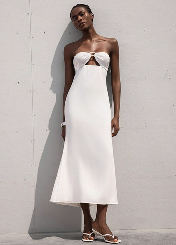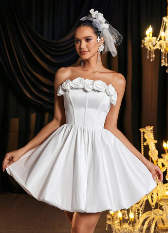 Весільна сукня SHEIN Belle білого кольору. Ця елегантна біла сукня ідеально підходить для весіль та урочистих випадків. Вона без бретельок і вигідно підкреслює фігуру. Сукня виконана з поліестерової тканини. Оздоблена збірками. Ця коротка сукня ідеально підходить для вечірок, дівич-вечорів та відпустки.