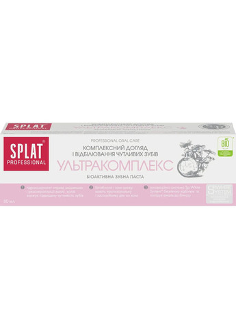Зубна паста Splat (Сплат) Professional Ultracomplex дозволить всім власникам чутливих зубів забути про свої побоювання і страхи перед використанням засобів по догляду за порожниною рота, адже її м'яка формула надає максимально дбайливий і делікатний вплив.