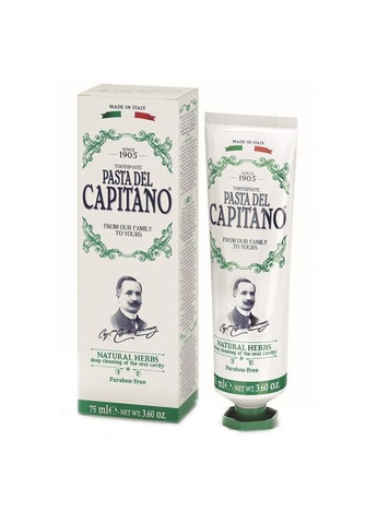 Зубна паста Pasta Del Capitano (Паста Дель Капітано) 1905 Natural Herbs гарантує свіже дихання та забезпечує максимальну гігієну зубів та порожнини рота. Основні переваги: 100% італійський продукт із натуральних інгредієнтів унікальна зубна паста, до складу якої входить безліч цінних і корисних трав, що позитивно впливають як на зубну емаль, так і стан слизової у складі пасти немає парабенів та інших шкідливих компонентів відмінно полірує та відбілює зубну емаль видаляє бактеріальний наліт та сліди від напоїв та їжі не викликає підвищеної чутливості ясен ідеально підходить для правильної щоденної гігієни ротової порожнини Характеристики Об'єм: 75 мл Виробник: Pasta Del Capitano, Італія.