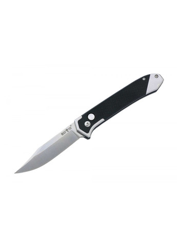 Стильний і надійний викидний ніж S-26 виробництва бренду Grand Way – це відмінний ніж для щоденного носіння, зручний, практичний і надійний. Клинок виготовлений з високоміцної нержавіючої сталі 8Cr13MoV. Введення до складу хрому, молібдену та ванадію роблять клинок винятково твердим, міцним і корозійностійким. Лезо довго підтримує гостроту ріжучого краю і не вимагає частої правки. Поверхню леза оброблено методом Stonewash. Завдяки цьому на клинку не помітні дрібні подряпини, сліди пальців і сонячні відблиски. Обух має скіс, переходить у вістря клинка. Замок для фіксації ножа Button Lock запускається натисненням кнопки. Для складання клинка також потрібно натиснути кнопку. Рукоятку складного ножа Гранд Вей S-26 виготовлено з товстих пластин – з одного боку гладкий метал, а з іншого – композитний матеріал G 10. Така комбінація забезпечує відмінну хваткість і хорошу ергономіку. Кліпса для прихованого носіння переставляється на будь-яку сторону ручки.