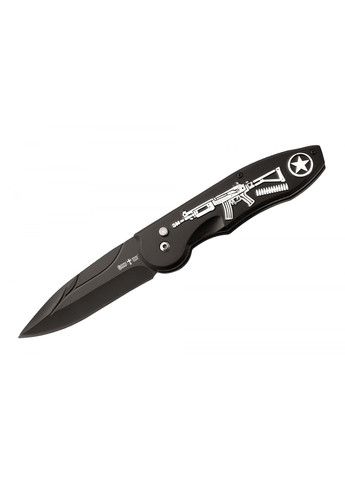 Яскравий і стильний клинок 701 AA виробництва торгової марки Grand Way напевно припаде до душі любителям активного способу життя, туристам і мандрівникам. Ця модель в першу чергу привертає до себе увагу стильним оформленням і ергономічною конструкцією. Клинок виконаний з бюджетної сталі 420 з низьким вмістом вуглецю, високою стійкістю до іржі і простотою заточки. Поверхня леза покрита чорним оксидним напиленням, яке надає моделі ефектності і захищає ніж від можливого псування. Механізм для викиду клинка Plunge Lock спрацьовує після натискання кнопки. Він простий в обслуговуванні, догляді та очищенні, безпечний при роботі. Рукоять ергономічної форми складного ножа Гранд Вей 701 АА виготовлена з металу, має декор у військовій тематиці. Форма рукояті повторює форму долоні і не вислизає навіть з вологих рук.