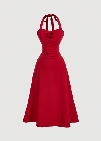 Це червона сукня з вирізом-халтером і розкльошеним подолом, має відкриту спинку і високу талію. Тканина середньої еластичності. Вона підходить для офіційних випадків, таких як випускний, повернення додому або особливі події.