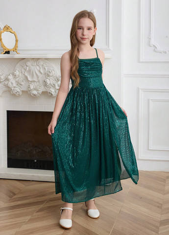 Вечірня сукня SHEIN з паєтками. Це довга сукня з високим коміром і розкльошеним подолом. Сукня виконана з паєток та поліестеру. Сукня має приталений крій та зелений колір. Підходить для урочистих заходів, таких як випускні вечори та вечірки. Рекомендації щодо догляду: ручне прання або професійне хімчистка.