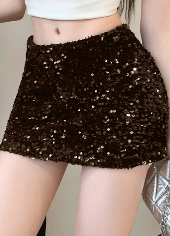 Ця міні-спідниця має стильний фасон, що підкреслює фігуру. Вона має низьку талію та стандартний крій. Спідниця застібається на блискавку і прикрашена тонкими паєтками. Тканина трохи тягнеться для зручності. Підходить для випускного вечора та для будь-якого сезону.