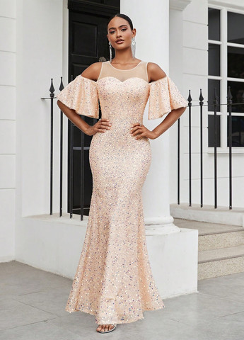 Елегантна сукня «русалка» з завищеною талією, вирізами на бретелях і холодними плечима. Сукня виготовлена з тканини з легким розтягуванням, прикрашена контрастними сітчастими вставками та блискітками для додаткового гламуру. Ідеально підходить для випускного вечора або особливого випадку.